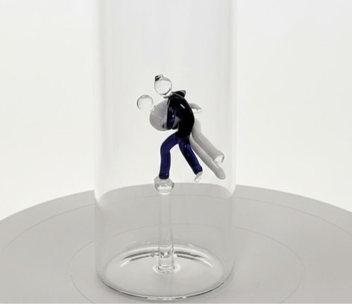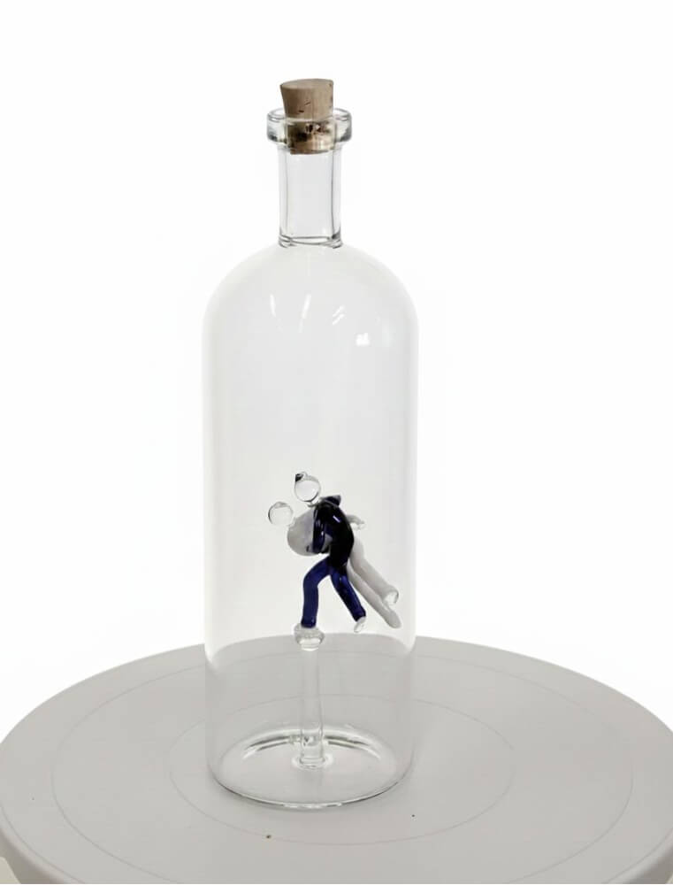 Skleněná láhev masivní rovná s judisty uvnitř - spojením kvalitního českého skla a umění juda vznikl unikátní designový výrobek – masivní skleněná láhev s ručně vsazenými judisty na dně.
