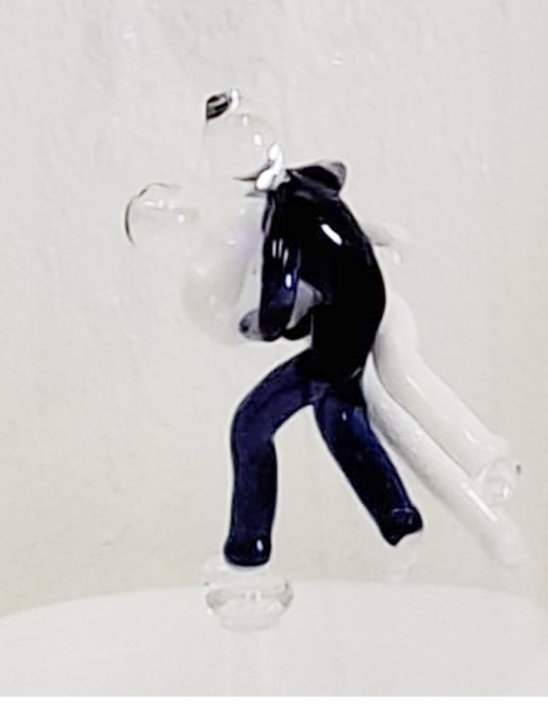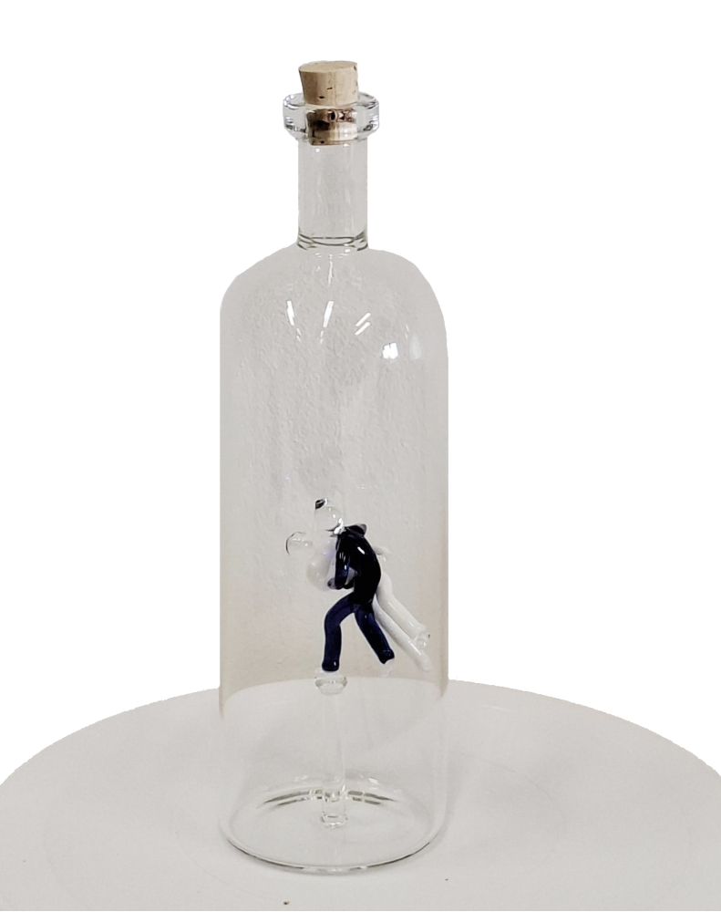 Skleněná láhev masivní rovná s judisty uvnitř - spojením kvalitního českého skla a umění juda vznikl unikátní designový výrobek – masivní skleněná láhev s ručně vsazenými judisty na dně.